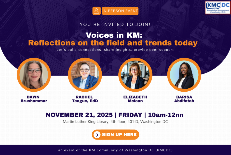 Attending Global KM week with DC Region with members of the Global Knowledge Management Network held at the Martin Luther King, Jr. Library.